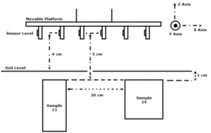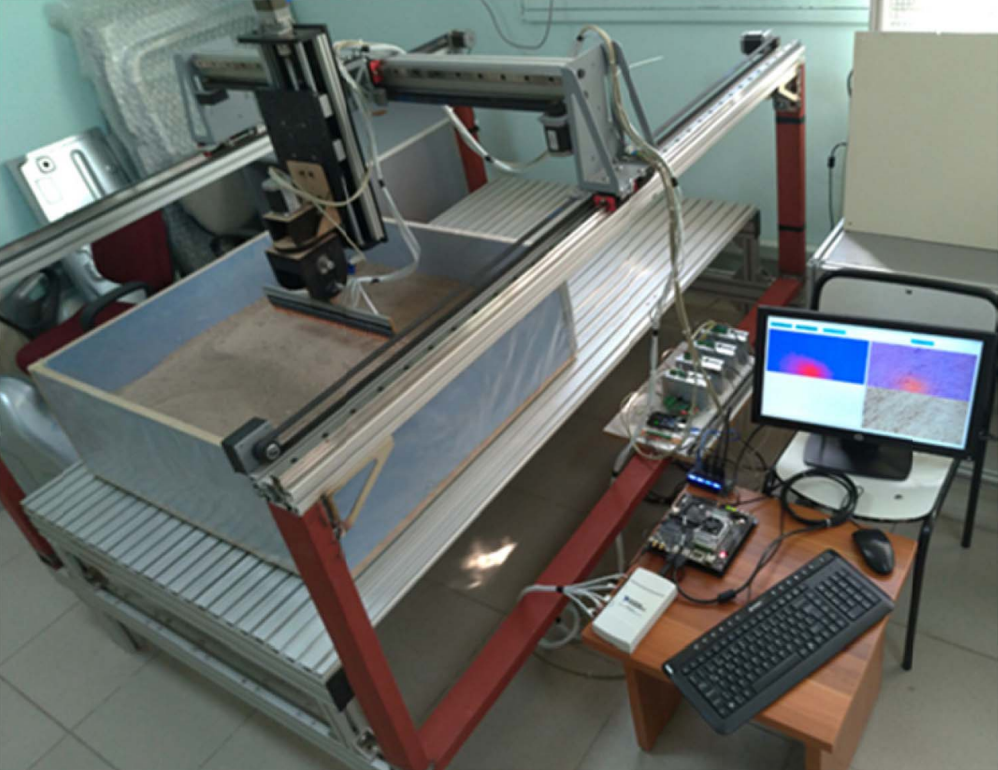 In recent times, studies about remote-sensing methods have focused on improving variables like sensing distance, sensitivity, and power consumption of available remote-sensing methods. The main target of this study is to improve these variables for the magnetic anomaly detection (MAD) method, in addition to determining upper surface geometry of the sheath with the support vector machine (SVM) algorithm to allow detection of buried ferromagnetic-sheathed explosives, minimize the number of false alarms, and thus shorten the scanning time. The classification process with the SVM algorithm separates this study from others. In line with this, instead of an external magnetic field source, in this study, the Earth's magnetic field was used with a TE100 fluxgate sensor, which has very low power consumption, used as a magnetic sensor to develop a highly sensitive new magnetic measurement and detection system. The system identifies anomalies in the vertical component of the Earth's magnetic field due to the magnetic characteristics of the buried sample in order to determine both the coordinates of the buried object within the scanning field and the upper surface geometry. The system is formed using a five-axis movement CNC platform including sensors and camera. Software was developed using python programming language with a QT graphical user interface (GUI) in order to control the CNC platform, take photographs of the soil, and process sensor data to ensure identification of the upper surface shape of the object under the soil. After obtaining all data for a 30×30 cm 2 scanning area, the software colors the data from blue to red and visualizes this transparently above a photograph of the soil on the monitor. After this stage, a model is created using thresholding, selective search algorithm, and SVM in order to identify the location and upper surface shape of the sample located within the measurement region. Tests performed after SVM training determined the system can classify the upper surface geometry of buried samples with 88% success. |