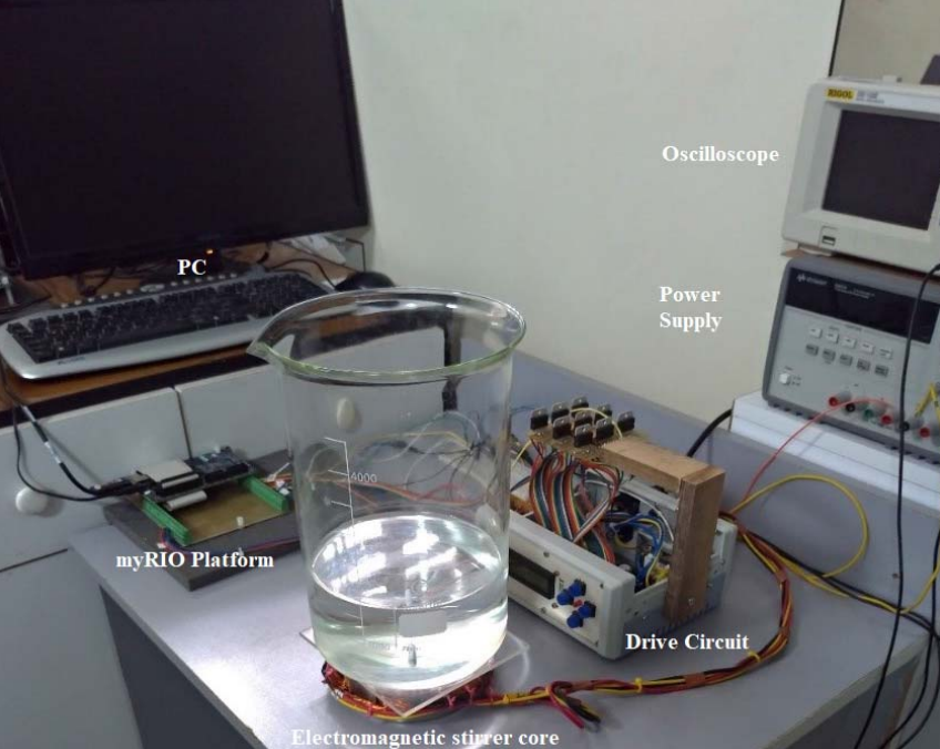 A microcontroller based rotating magnetic stirring system has been developed in this study. A mathematical model is proposed to get electromagnetic field solutions. The magnetic stirring system consists of four-phase half-wound coils with phase currents of lambda/2 radian phase difference to achieve a rotating magnetic field. During the application, the liquid to be stirred is placed on the stirrer in a beaker and a magnetic stir bar in the form of a magnet rod is dipped in. The magnetic stir bar, influenced by the magnetic field supplied by the system, stirs the liquid rotating around the center of the rotational field. An adjustment of the frequencies of the voltage applied to these coils is done through a supply circuit with a developed PIC microcontroller. Within the scope of this study, operating principle and the mathematical model of the rotating magnetic stirring system have been discussed. Experimental results for the initial prototype are also presented in detail. Furthermore, parameter optimization for the stirrer is performed. |