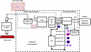 The counts, the so-called differential counts, and sizes of different types of white blood cells provide invaluable information to evaluate a wide range of important hematic pathologies from infections to leukemia. Today, the diagnosis of diseases can still be achieved mainly by manual techniques. However, this traditional method is very tedious and time-consuming. The accuracy of it depends on the operator’s expertise. There are laser based cytometers used in laboratories. These advanced devices are costly and requires accurate hardware calibration. They also use actual blood samples. Thus there is always a need for a cost effective and robust automated system. The proposed system in this paper automatically counts the white blood cells, determine their sizes accurately and classifies them into five types such as basophil, lymphocyte, neutrophil, monocyte and eosinophil. The aim of the system is to help for diagnosing diseases. In our work, a new and completely automatic counting, segmentation and classification process is developed. The outputs of the system are the number of white blood cells, their sizes and types. |