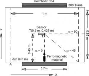 Recent studies on remote detection methods were mostly for improving variables like sensing distance, sensitivity and power consumption. Especially using anisotropic magneto-resistive sensors with low power consumption and high sensitivity for detecting subsurface magnetic materials became very popular in last decades. In our study, for detecting subsurface materials, we have used fluxgate sensor network for having even higher sensitivity and also minimizing the power consumption by detecting the changing rates of horizontal component of earth’s magnetic flux which is assumed to be very low. We have constituted a magnetic measurement system which comprises a detector system, which has a mechanism enables sensors to move in 3-D space, a data acquisition module for processing and sending all sensor information, and a computer for running the magnetic flux data evaluation and recording software. Using this system, tests are carried out to detect anomalies on horizontal component of earth’s magnetic flux which is created by different subsurface materials with known magnetic, chemical and geometric properties. The harmonics of horizontal component of earth’s magnetic flux in scanned area are analyzed by the help of DSP Lock-In amplifier and the amplitudes of high variation harmonics are shown as computer graphics. Using the graphic information, the upside surface geometry of subsurface material is defined. For identifying the magnetic anomalies, we have used the scale-invariant feature transform (SIFT)-binary robust invariant scalable keypoints (BRISKs) as keypoint and descriptor. We used an algorithm for matching the newly scanned image to the closest image in database which is constituted of mines and possible other metal objects like cans, etc. Results show that, if the proposed detection system is used instead of metal detectors which cannot distinguish mines from other metal materials and alert for every type of metal with different geometries, it can be said that miss alarm count, work force and time can be decreased dramatically. In this paper, mostly the setup of the system is described and in Appendix A some experimental outputs of the system for different geometries of metal samples are given. And also for comparing the results of the proposed system, additional experiments are carried out with a different type of sensor chip, namely KMZ51, and also given in Appendix A. |